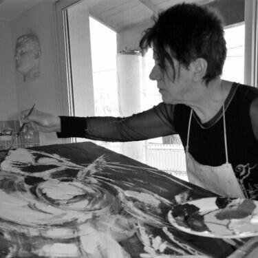 Je peins désormais ce que je suis à l’intérieur de moi. »Dans son atelier, les taches de peinture couvrent le sol comme les échos de son imagination.